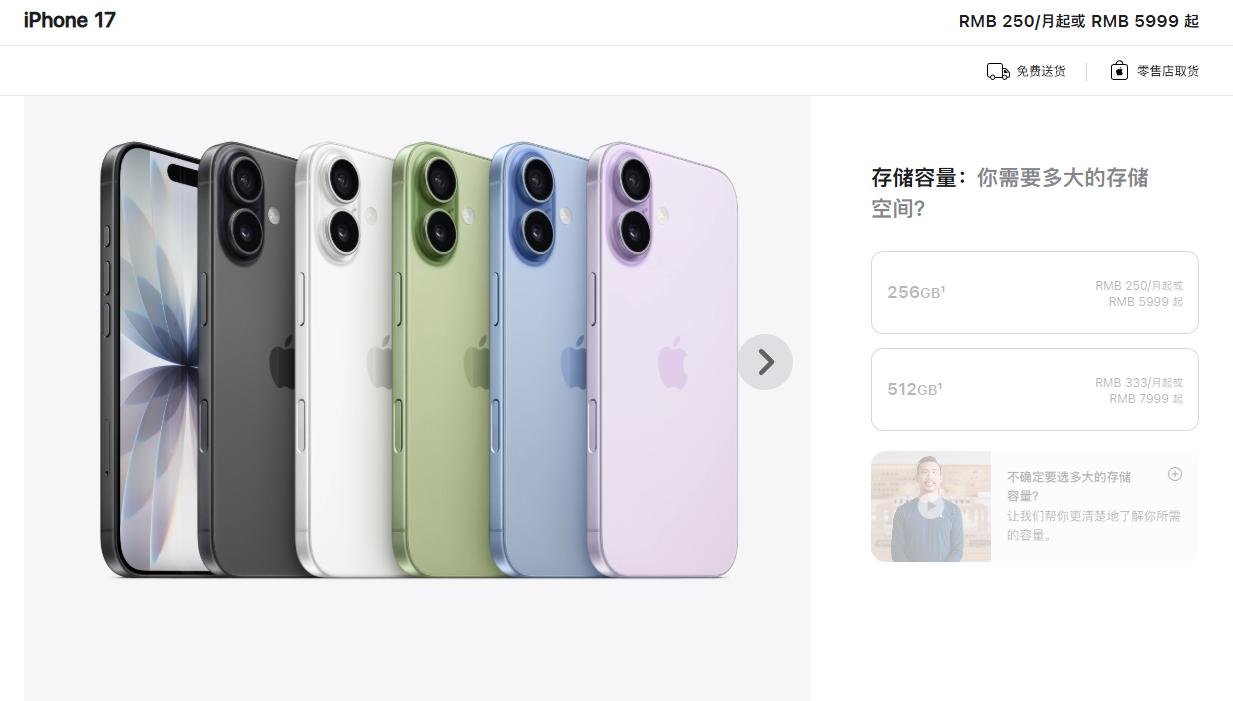 2、iPhoen17标准版实际上是变相降价了,5999元 256G,相比iPhone16同版本直接便宜1000块钱,然后还能叠加国补,相比前代相当于便宜了1500块钱。