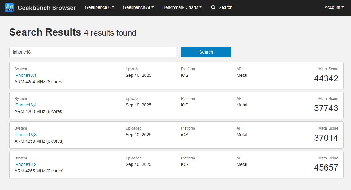 下图就是目前已有的跑分数据,最高分是44342分,应该是A19Pro(6核跑的),然后低分是37743分富旺配资,是A19或者A19Pro(5核心版)跑的。