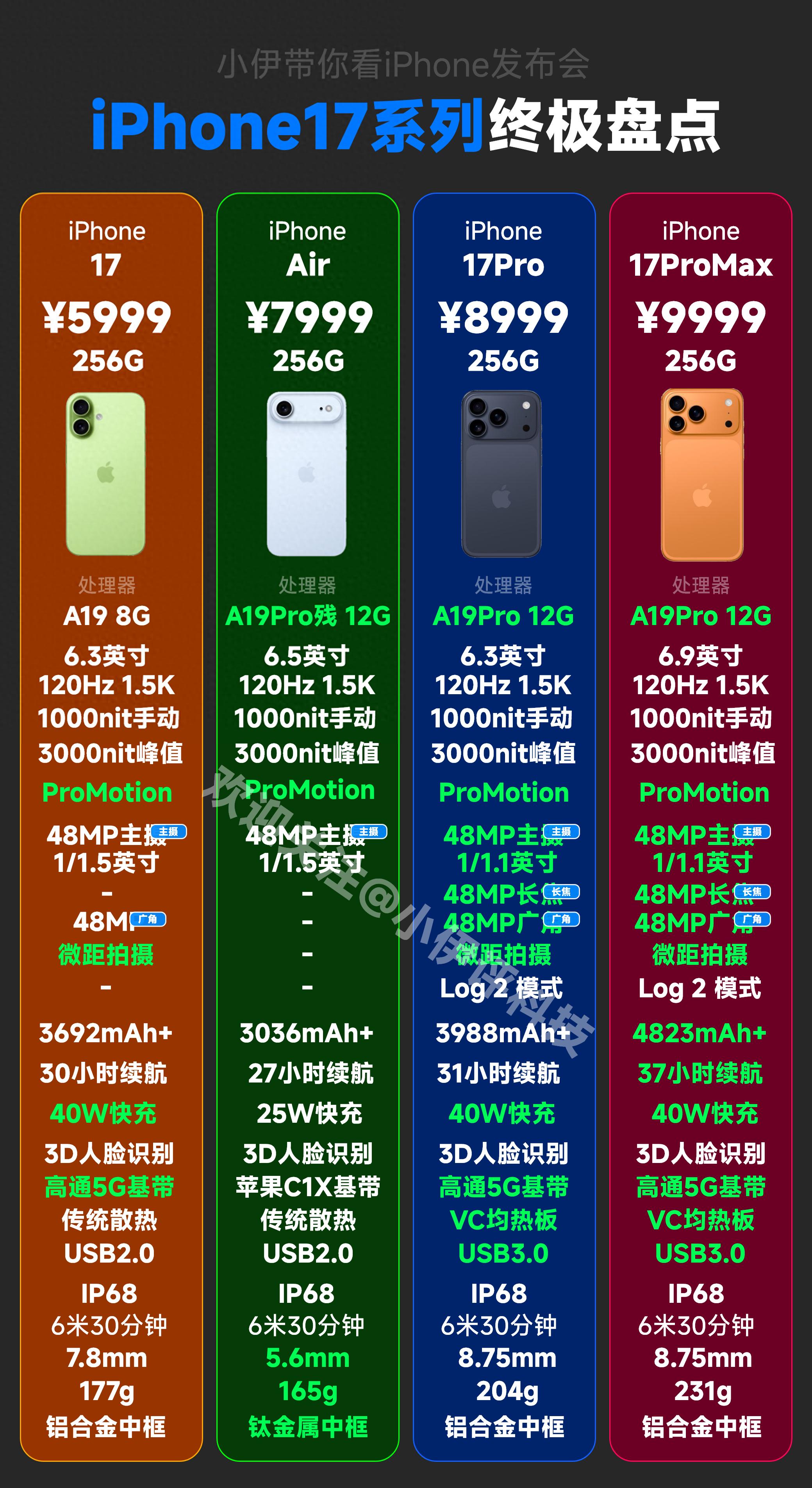 开始,还是很多人呼声比较高的一图流,给大家详细罗列一下iPhone17不同版本的差别。