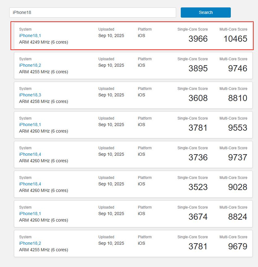 目前相关跑分已经大量的出现在了Geekbench6.0的数据库中,截图如下:目前跑分最高的是单核3966,多核10465分(Geekbench 6)