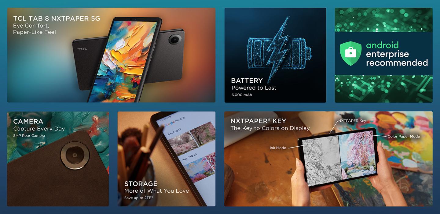 TCL TAB 8 NXTPAPER 5G 搭载一块 8.7 英寸 800×1340 分辨率 180PPI 像素密度的 NXTPAPER 4.0 技术面板,在展现出众色彩的同时能够带来模拟自然光线的视觉体验。