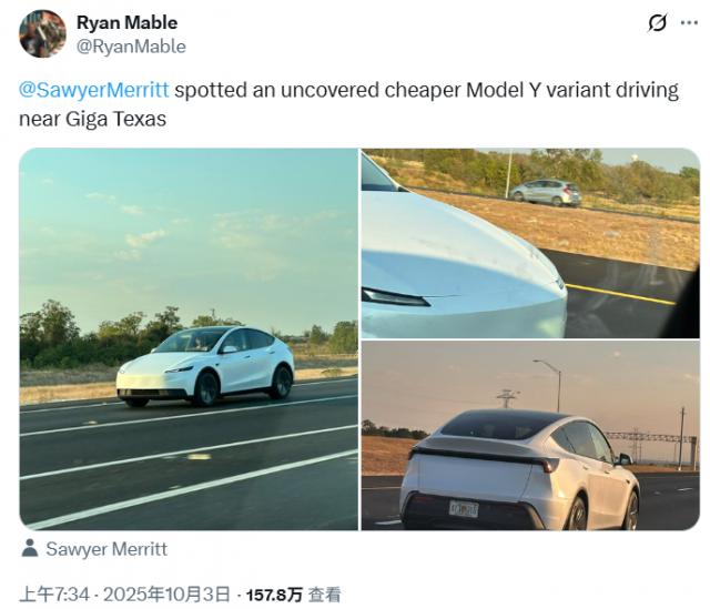 社交媒体上也有美国网友爆料称,在特斯拉得州工厂附近目击到没有覆盖伪装的"平价版 Model Y "。